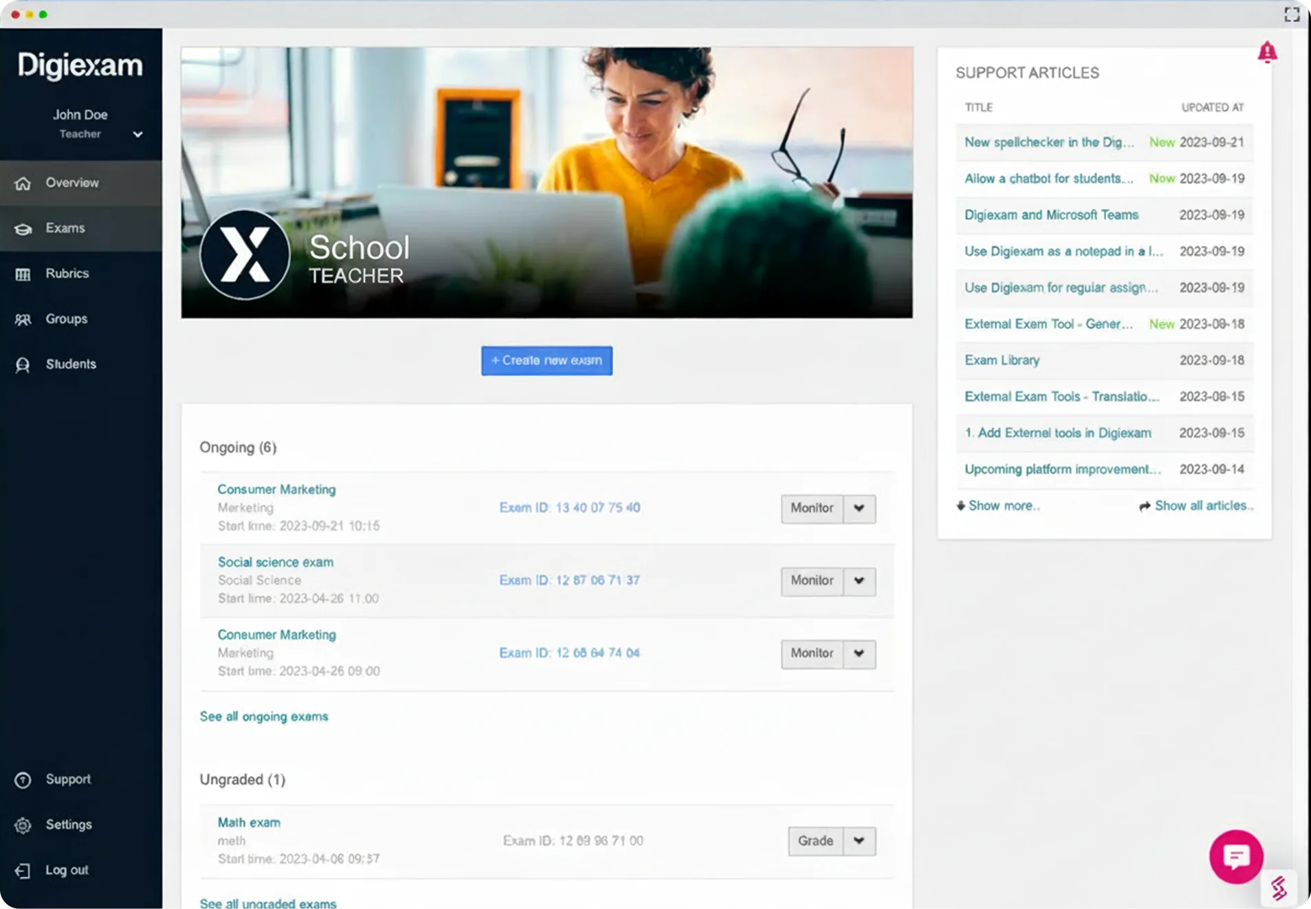 Teachers create and configure exams directly in the LMS, selecting which resources students can access.